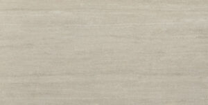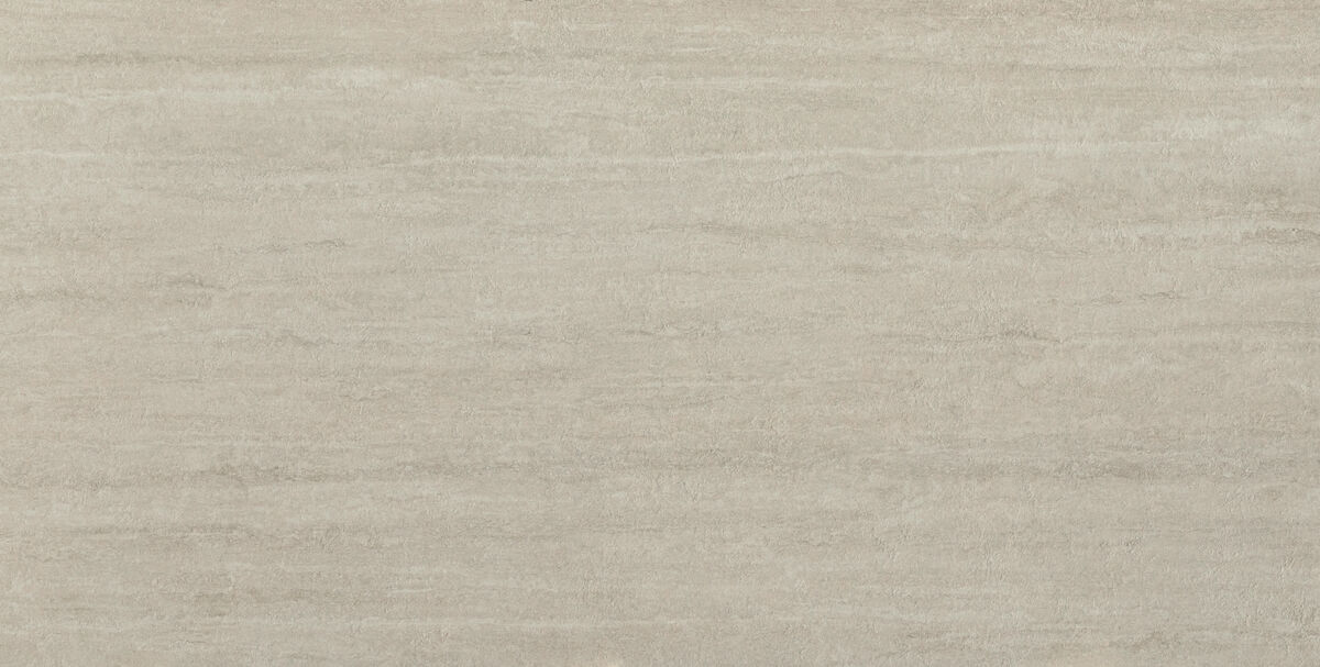 Misty clays create a two-toned earthy base banded with silver greys, creating the dense linear appearance of ancient travertine, enhanced by tiny oxidized puddles. Metallic accents, layers of fine alloy stratum, and creamy streaks blend into the neutral palette, giving it an airy appearance, in Stone finish.